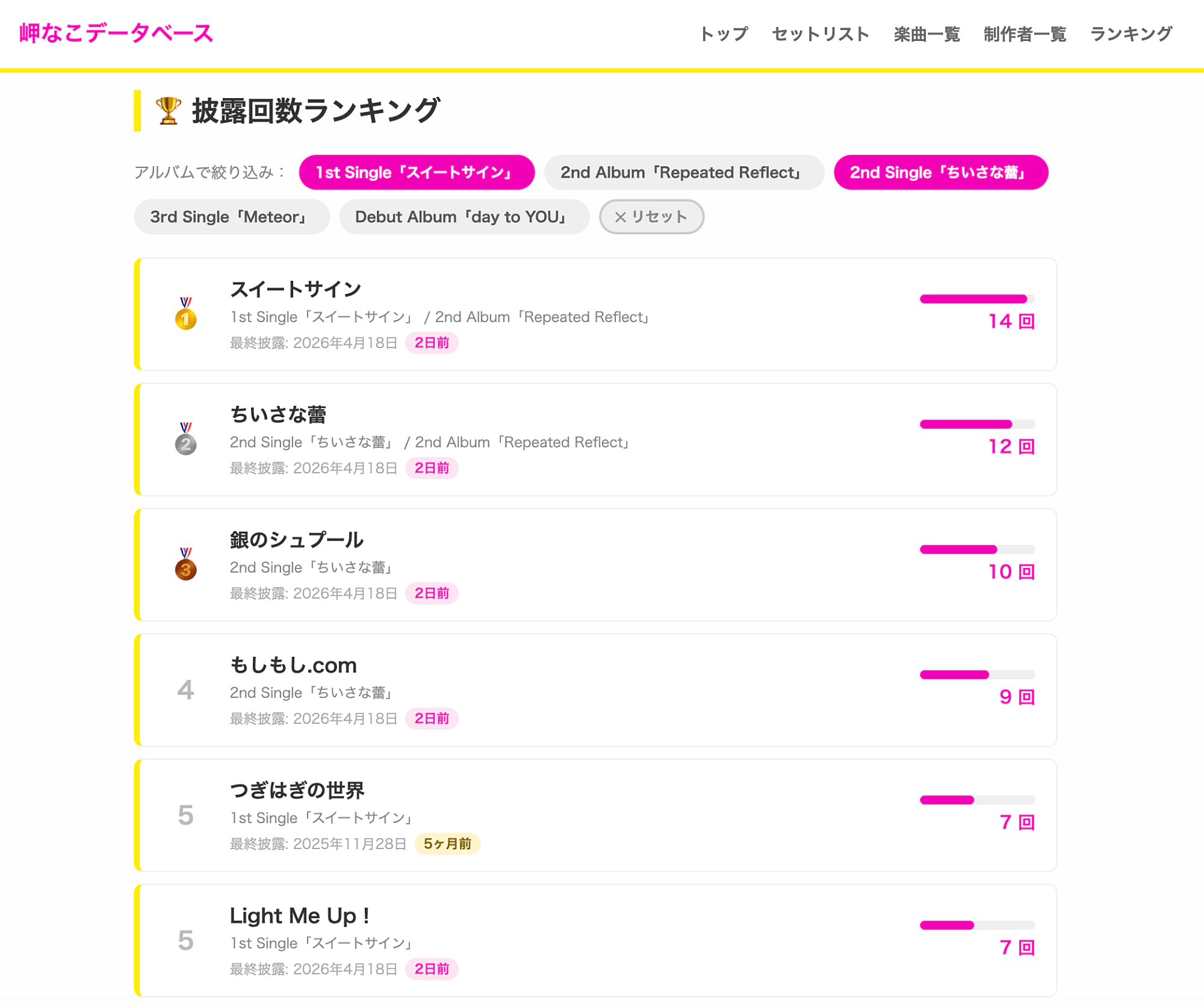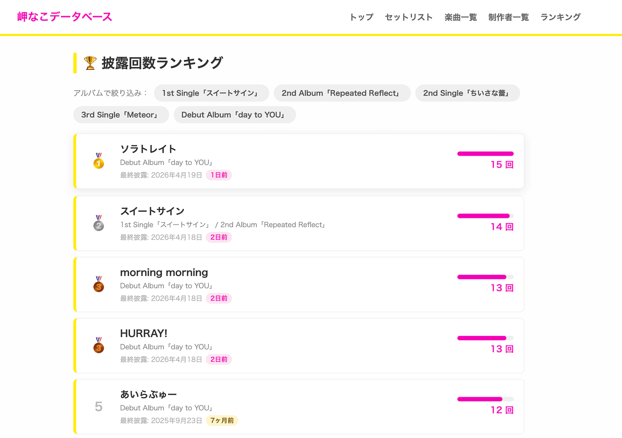 ランキングページの詳細はこのような形です。ぜひセットリストの予想などにお使いください。