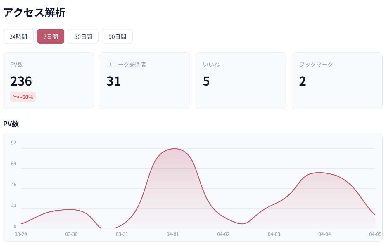 記事ごとの閲覧数やいいね数、ブックマーク数などをダッシュボードで確認できます。 どの記事が読まれているか、どんな反応があるかを把握して、次の記事づくりに活かせます。