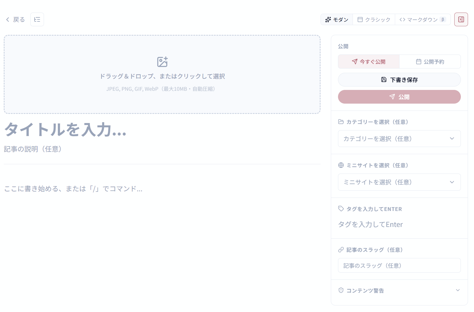 mochottには、高機能なエディタが搭載されています。 見出し、太字、リスト、画像の挿入など、直感的な操作で記事を書くことができます。 Markdownに慣れている方は、Markdownモードも選べます。