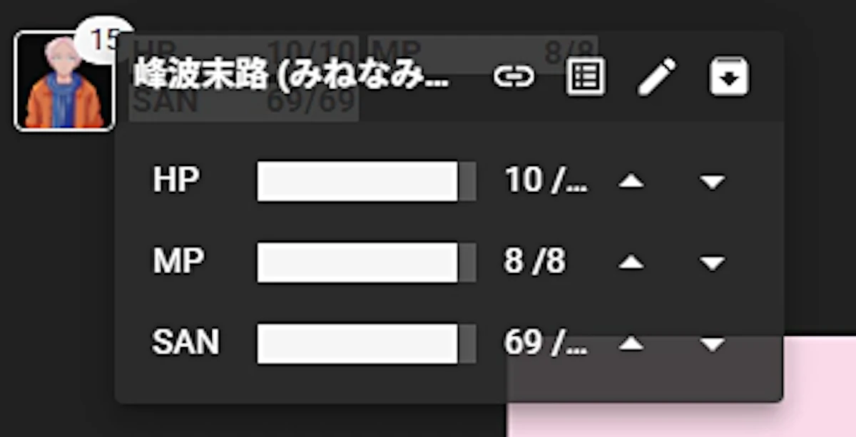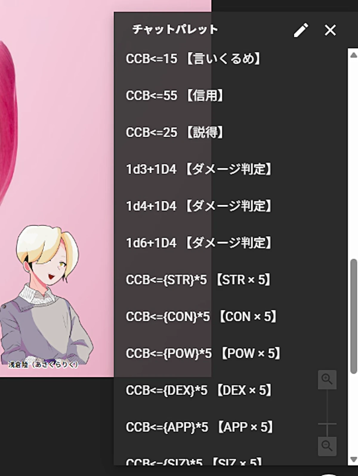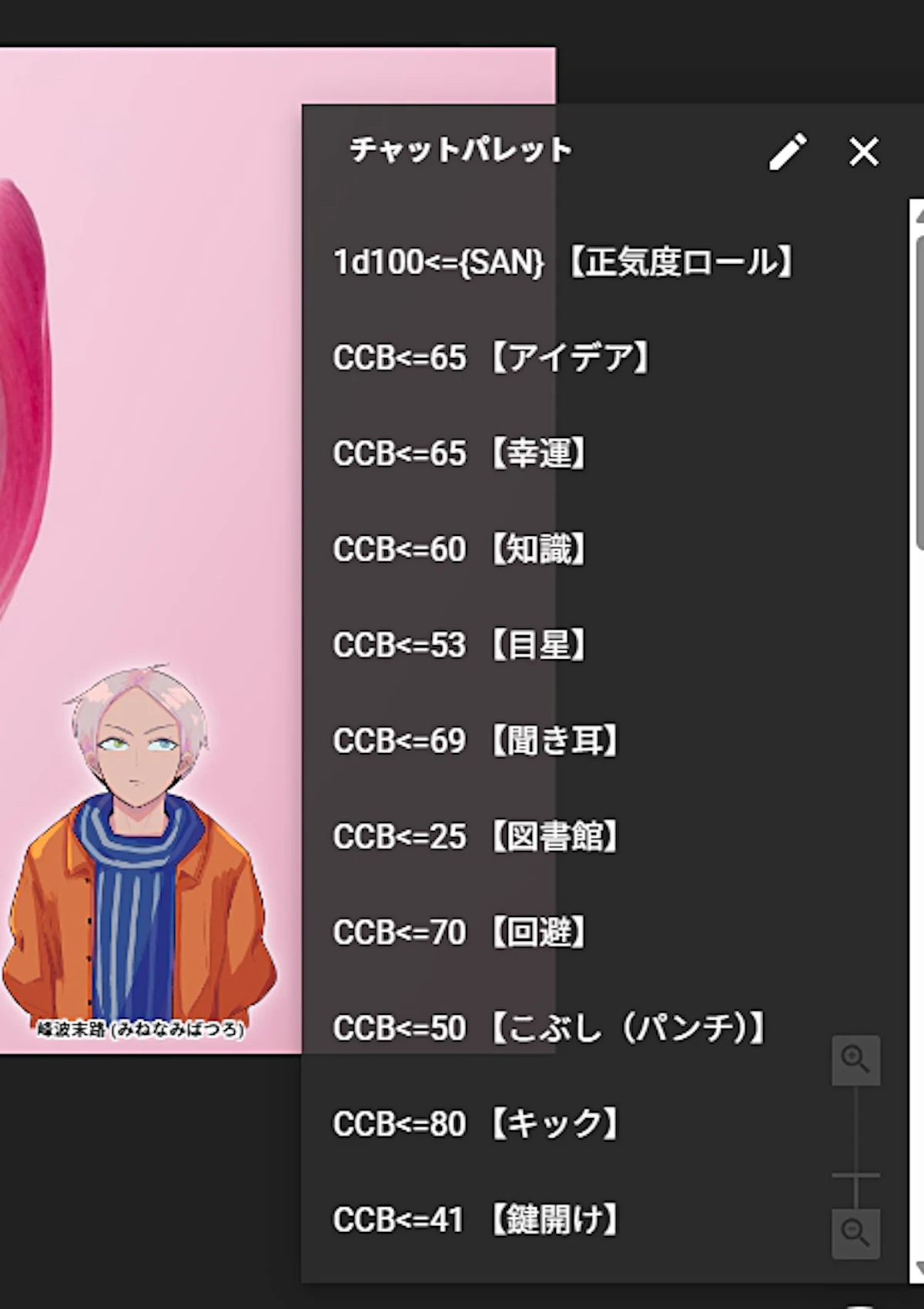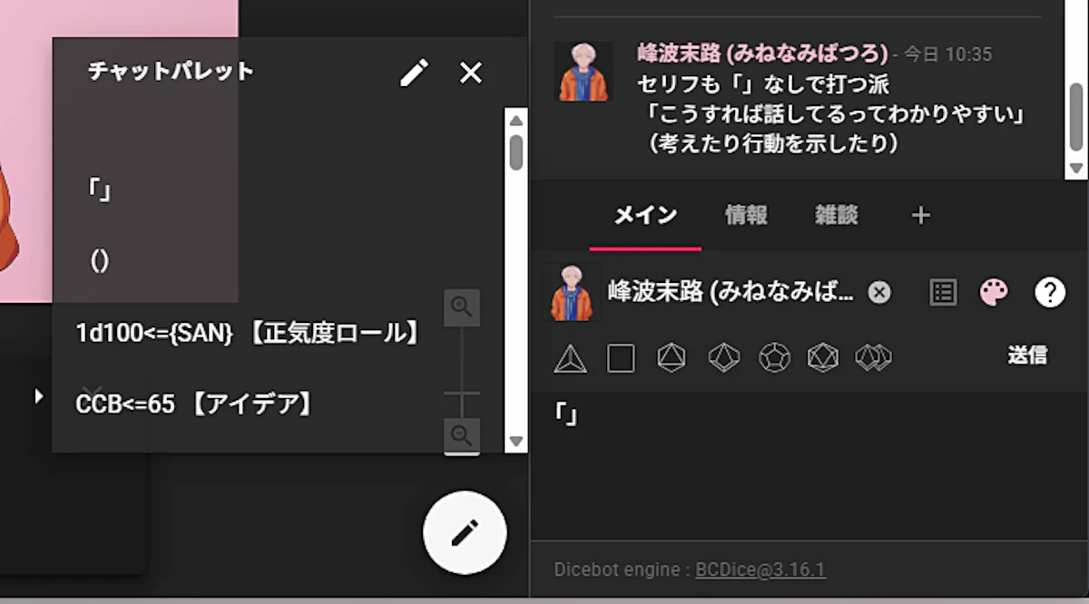 ココフォリアの最新アップデートでチャパレを開ける箇所が増えました。今までチャットパレットはチャット欄の自分の名前の右とかからしか開けなかったと記憶しているのでかなり使いやすくなりました。さらにキャラコマ等から選択したチャパレはもともと選択していたキャラ名を上書きすることができるので誤爆(KPCで振るつもりがKPで振っちゃう)がかなり減りました。ありがたい…ちょうど複数人のNPCが出るシナリオを回す予定だったので活用しようと思ったのですが…