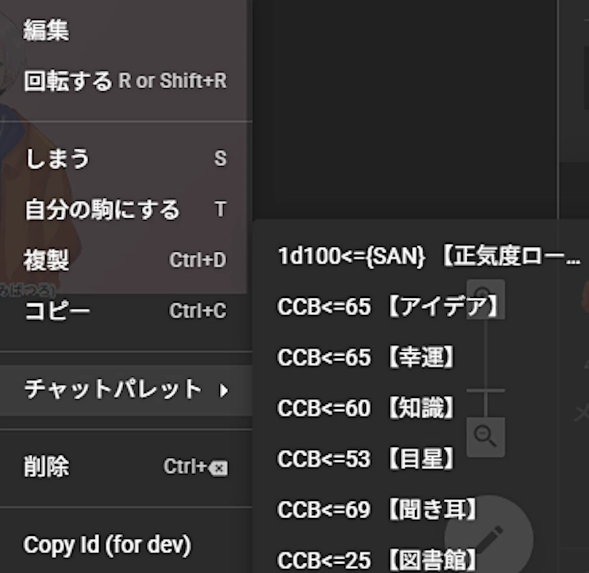 コマを右クリックで出すチャパレがいちばん便利かな?と思い、コマを全部盤面に出してプレイしたのですが、ここから出てくるチャパレは文字も小さいしスクロールもしにくいです。目当ての技能がちょうどスクロールとスクロールの間に挟まって選べねえよ…おれは無力だ…と悲しみに包まれてしまいました。